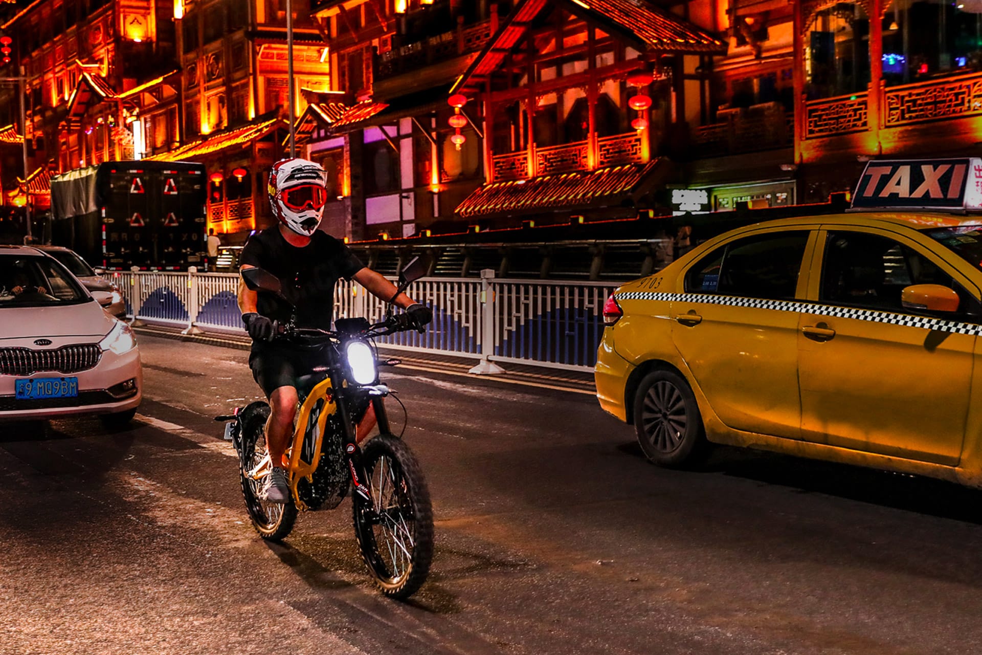 60V e mais de 6kW de potência de pico de uma bateria removível Panasonic de íon de lítio. Moldura de liga leve forjada combinada com componentes hi-spec, peso total de apenas 56 kg. 4 Freios a disco hidráulicos de pistão dianteiro e traseiro. Painel LCD com ponto de carregador USB. Destinado a jovens a adultos, com uma capacidade de escalada superior a 45° oferece horas de diversão quase silenciosa com um alcance de 50-70 km por carga, dependendo do modo. Velocidade máxima 45 mph +, recarga rápida 4 horas.